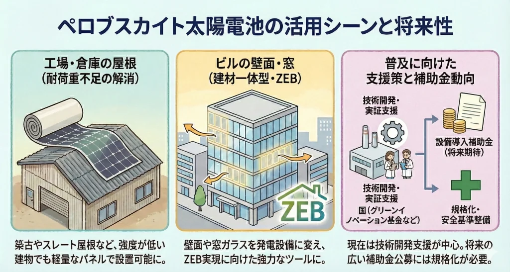 つまり、一般的なシリコンパネルと同じように、企業が当たり前に購入・設置できるようになるには、あと数年(2030年頃まで)の技術成熟と量産化を待つ必要があるというのが現実的な見方です。
