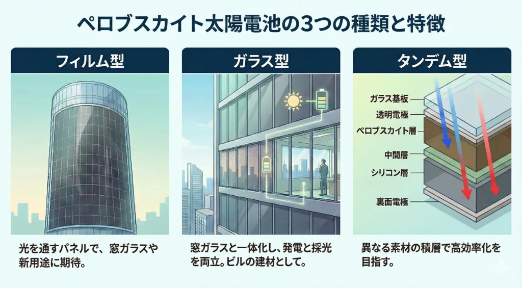 一口にペロブスカイト太陽電池と言っても、実は基材や構造の違いによって大きく3つのタイプに分類されます。設置場所や目的に応じて使い分けが進められています。